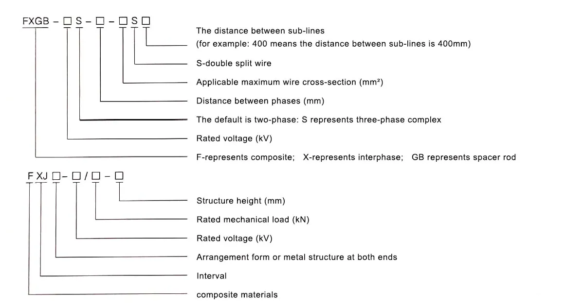 | Specifications and models | Rated voltage kV | Phase distance (mm) | Rated tensile load kN | Rated bending load kN | Compression withstand load kN | Torsional withstand load kN | Insulation distance (mm) | Minimum nominal creepage distance (mm) | Lightning full-wave impulse withstand voltage (peak) kV is not less than |