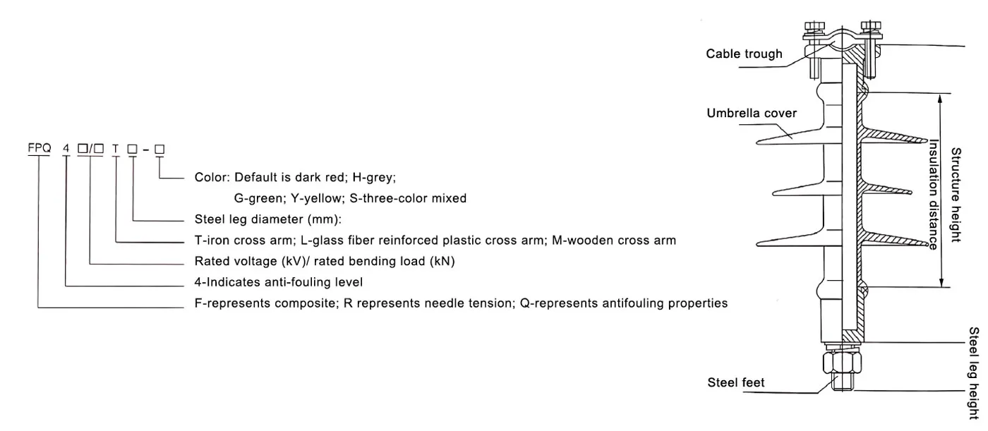 | Specifications and models | Rated voltage kv | Rated bending load KN | Steel foot thread diameter length (mm) | Clamping range (mm) | Structure height (mm) ±10 | Minimum arc distance (mm) | Minimum nominal creepage distance (mm) | Lightning full-wave impulse withstand voltage kV | Power frequency wet withstand voltage 1min kV | Corresponding to other different model descriptions |